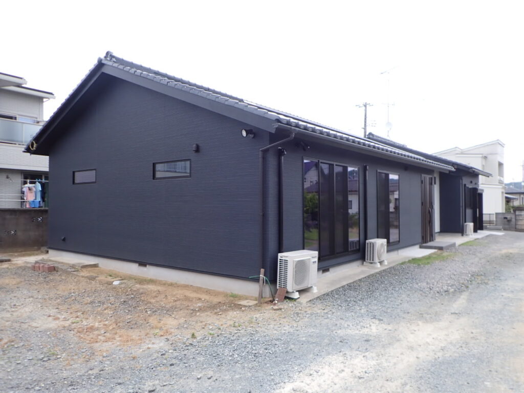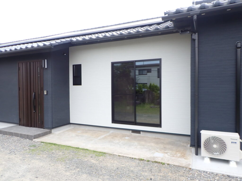 屋根・外壁 いわき市リフォームはつせリフォーム福島県小名浜外壁リフォーム外壁サンディング W様外壁リフォーム工事(いわき市小名浜) 2026年1月10日 2026年1月14日 既存外壁撤去を行い、新規防水透湿シート工事、新規外部胴縁工事を行い、 窯業系サイディング工事を行いました。 和瓦が青系の色でしたので外壁も紺色でまとめ統一感を出し、サッシを黒色にし、引き締めた感じに仕上がりました。 ワンポイントの白色の外壁、焦げ茶の玄関ドアも良いアクセントになっています。